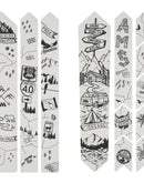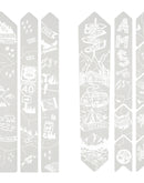 - 12 parts for a universal protection system: 1 big part for the downtube, 2 long arrows for the fork or the seat stays, 1 big part for the top tube or the seat tube, 8 arrow parts for cable rub protection and areas where tyre fits tight with the frame